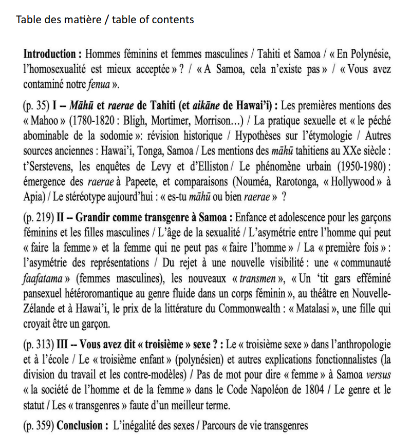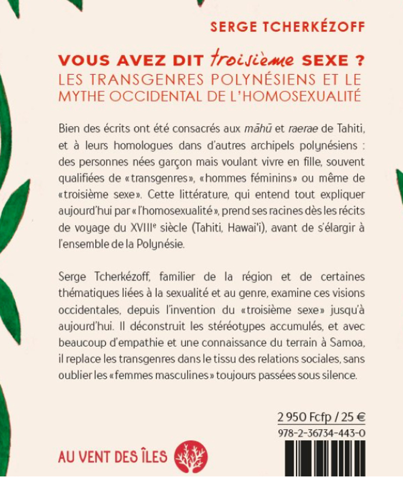 Ouvrage : Vous avez dit ’troisième sexe’ : les transgenres polynésiens et le mythe occidental de l’homosexualité (Papeete, Au Vent des Iles, 2022).